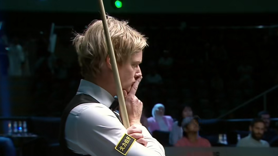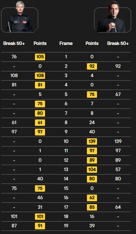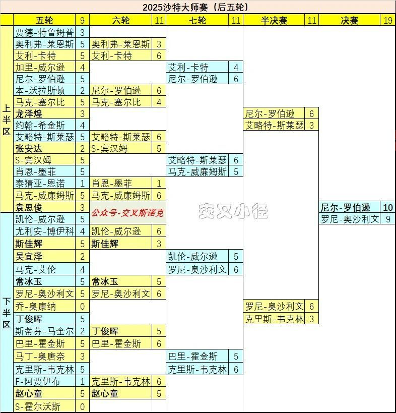 下半场,第9局,奥沙利文走位失误,打丢一杆制胜机会,然后强攻失误漏球,罗伯逊接手一杆97分准清台,7-2,将分差拉开到5局。
